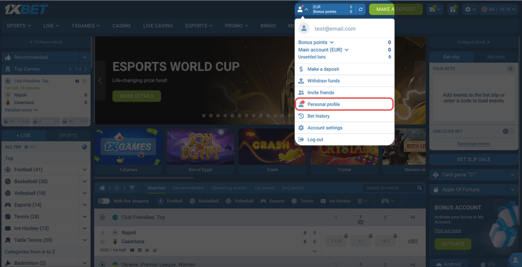 Log in to the 1xBet website and open your profile (the icon in the top right corner).