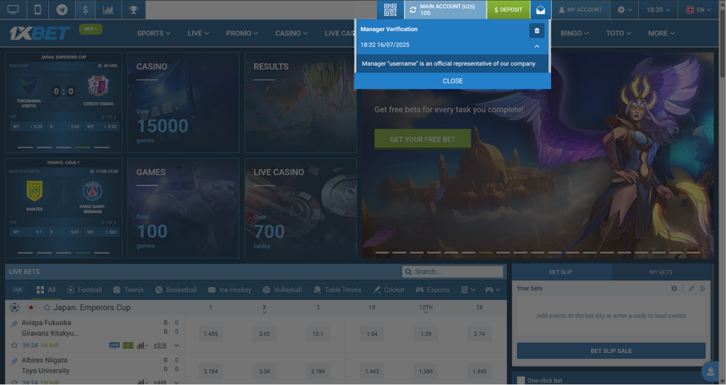 Within a few minutes, you’ll receive a notification on the 1xBet website with confirmation that the manager you’re speaking with is an official representative for the company